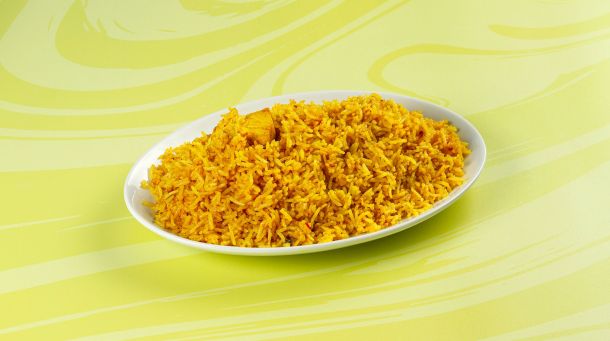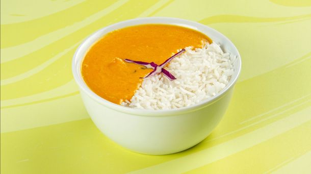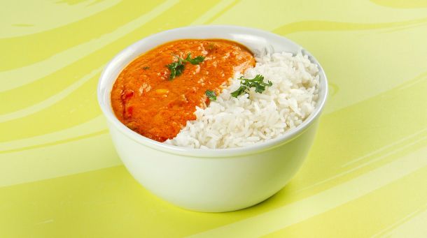 Κοτόπουλο tika μαριναρισμένο & μαγειρεμένο σε mix μπαχαρικών & σάλτσα κόκκινη. Συνοδεύεται από ρύζι basmati