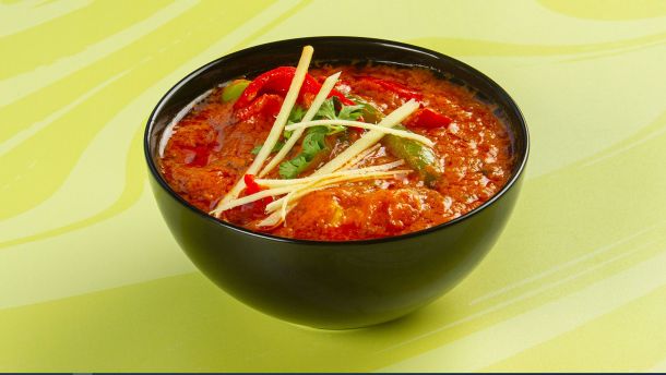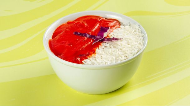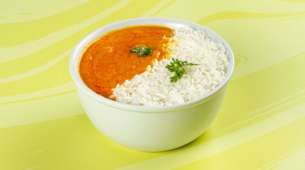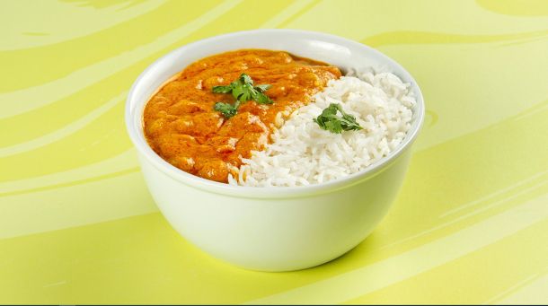 Κοτόπουλο tika μαριναρισμένο & μαγειρεμένο σε mix μπαχαρικών & σάλτσα κόκκινη. Συνοδεύεται από ρύζι basmati